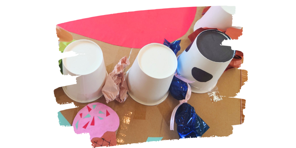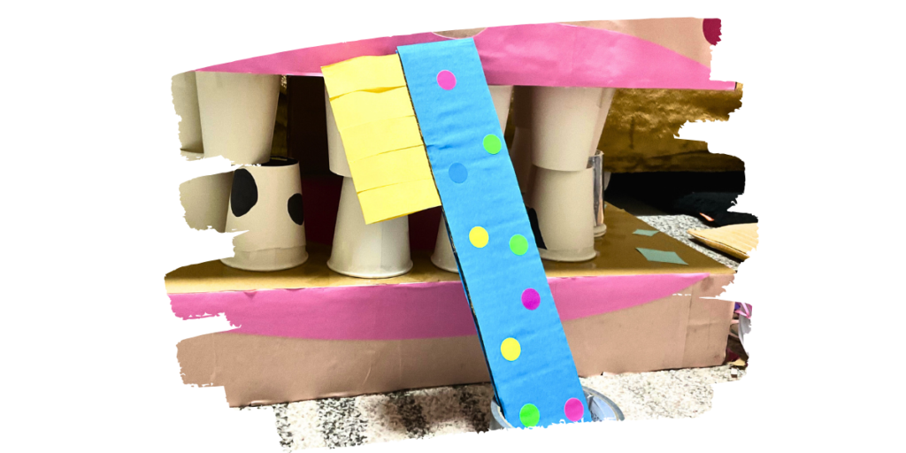 画用紙を丸めて食べかすにみたてたり、紙コップを黒く塗って虫歯をつくってみます。